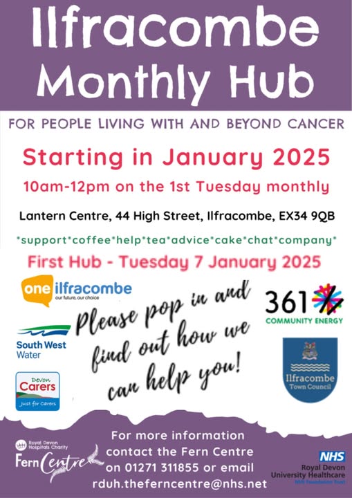 A reminder that there is a monthly Cancer Care Hub held at the Lantern Centre, Ilfracombe on the 1st Tuesday of every month.